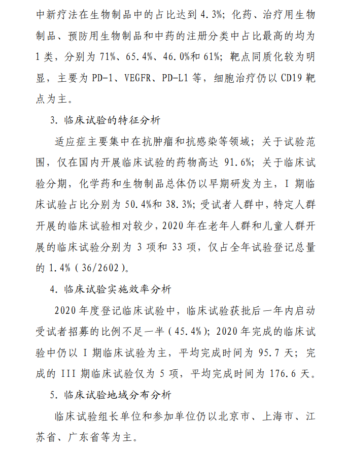 本报告根据2020年度登记的药物临床试验信息,从申办者类型、药物类型、试验品种、适应症、试验分期、特殊人群试验、临床试验的组长单位、启动耗时和完成情况等角度对临床试验的整体进展、主要特点、变化趋势、和突出问题等进行汇总、梳理和分析。