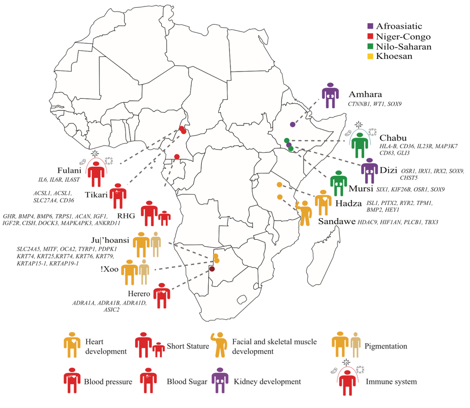 现有研究表明,现代人类起源于非洲,相比于其它大陆,现代人类在非洲居住时间最长,并且在迁徙,融合和对环境适应性进化的过程中形成了超过3000个民族和2100种语言。目前非洲人群不仅具有世界上最丰富的遗传多样性和表型多样性,并且现代人类近三分之一的语言都在非洲,是全世界语言最为多样化的地区之一。然而,目前的遗传学和基因组学的研究中,只有不到3%的样本来自非洲,存在严重的滞后性。研究非洲人群遗传多样性不仅将加深我们对于现代人类起源、早期遗传结构以及适应性进化的理解,并且也能为健康和诊断研究及开发提供丰富的新遗传信息。北京时间3月3日,国际顶尖期刊《细胞》(CELL)以“全基因组测序揭示非洲人群的复杂演化历程与对环境的适应性进化(Whole-genome sequencing reveals a complex African population demographic history and signatures of local adaptation)”为题在线发表了封面文章,呈现了以复旦大学生命科学学院和人类表型组研究院樊少华青年研究员为第一作者、宾夕法尼亚大学遗传学系莎拉·蒂什考夫(Sarah A. Tishkoff)教授为通讯作者的国际科学团队历时7年完成的最新研究成果。该研究对极具代表性的非洲12个群体的180位个人进行了全基因组测序分析。这些民族地理分布广泛,以种植农业、打猎收集和游牧等不同方式为生,并且涵盖了非洲四个主要的语系。外域基因渗入与严重群体瓶颈导致部分非洲人群遗传多态性低