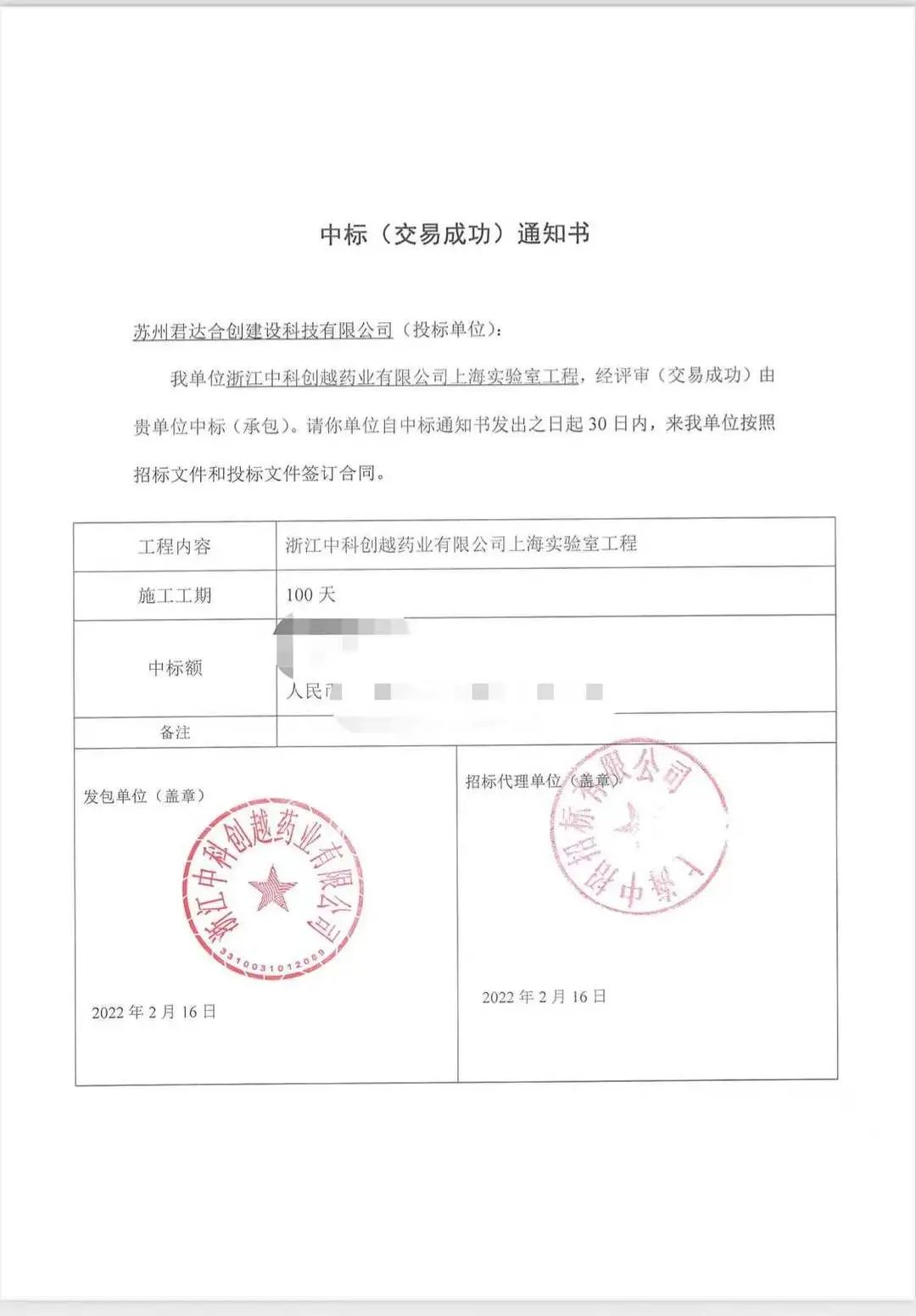 开年喜报,苏州君达合创又下一城!近日,《浙江中科创越药业有限公司上海研发中心中标通知书》发送至君达合创。