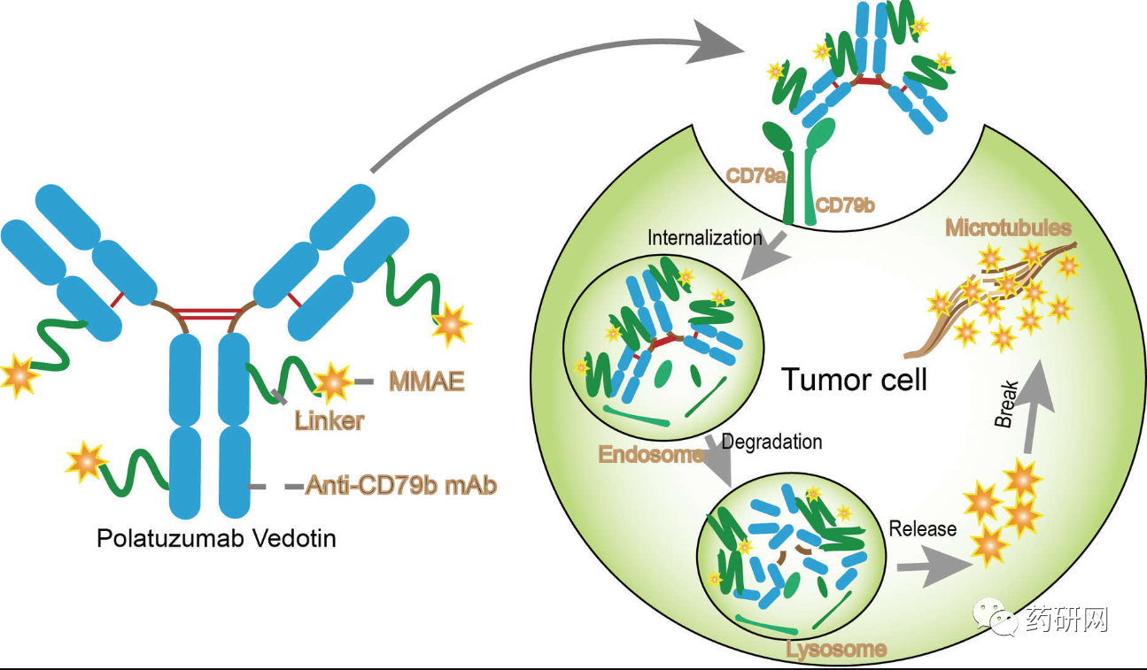 Polatuzumab vedotin是Polivy的活性成分,Polivy由靶向CD79b的人源化单克隆抗体(mAb)和MMAE通过高度稳定的新型可裂解连接子(VC)偶联而成,DAR为3.5.