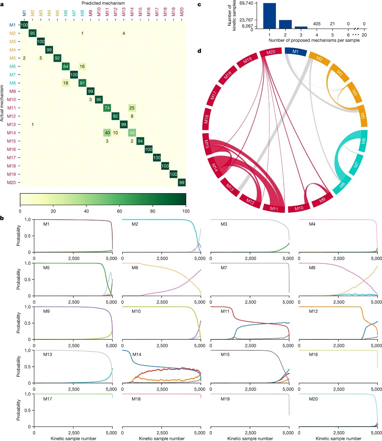 图2. 催化机理的范围和数据的构成。图片来源:Nature该模型包含 576000 个可训练参数,并结合使用两种类型的神经网络:1)长短期记忆(LSTM)神经网络,一种用于处理时间数据序列(即时间浓度数据)的循环神经网络;2)全连接神经网络,用于处理非时间数据(即每次动力学运行中催化剂的初始浓度和长短期记忆提取的特征),输出为每种机理的概率,概率总和等于1。另外,在训练过程中还进行了数据扩增,包括:1)将样本中的浓度-时间点数量从20减少到20-3范围内的任何值;2)在 S 和 P 的样本浓度值上引入高斯误差。随后,作者使用100000个动力学样本(每个机理5000个)的测试集评估了训练模型,每个样本包含6个浓度-时间点。值得注意的是,测试集中的所有动力学样本都属于独特的动力学曲线,不同于训练集中使用的动力学曲线。该模型提供了92.6%的分类准确度和100%的top 3准确度,而其它机器学习方法(如:相似性搜索、支持向量机和随机森林)却提供了较差的结果。有趣的是,对实际机理与预测机理的混淆矩阵分析表明大多数机理都被正确预测并具有非常高的召回率(图3a),而大多数错误聚集在2个激活机理(M6和M8)之间和3个失活机理之间 (M11、M12和M14)。另外,对每种机理的样本预测的概率曲线分析表明在大多数测试样本中,该模型的预测结果非常准确(图3b),而准确度较低的测试样本主要是由于动力学空间的重叠所致。通过允许对预测机理进行分组(图3c),模型分类的准确率高达99.96%(即在100000个样本测试集中只有38个错误),其中69740个测试集样本被预测为独特的机理,23767个样本有2个可能的机理,6067个样本有3个。需要指出的是,该模型倾向于将机理分组在同一类别中,并且类别之间的交叉点很少(图3d),这表明通过单一机理分类获得的最初7.4%的不准确性大部分是由于机理之间的重叠所致。
