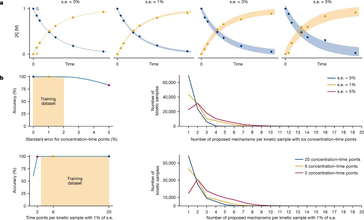 图3. 机器学习模型在测试集上的性能,每个动力学曲线有六个时间点。图片来源:Nature为了探索模型的潜力,作者研究了引入错误数据和改变数据点数量对模型预测结果的影响,同时在原始测试集的浓度变量上引入了不同级别的高斯误差。如图4b所示,即使测试集数据中存在明显的标准误差(高达2%),该模型仍然能够保持非常高的分类准确度(>99.6%);即使是质量较差的数据(s.e. = 5%),分类准确度也达到了83%。另外,作者还使用1% s.e. 的数据集探索了改变提供给模型预测的浓度-时间点数量的影响,结果显示包含2-20个浓度-时间点的测试集都获得了高分类准确度。该模型能够使用额外的时间点信息来增加正确预测单一机理的比例(图4b,右下角)。相反,当浓度-时间点减少到6个以下时,预测多组机理的数量会增加。
