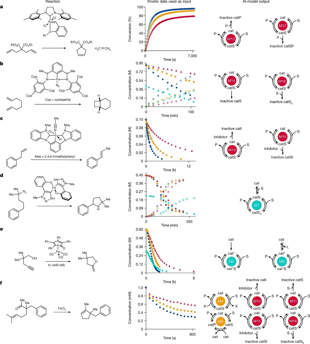 图4. 误差和数据点数量对机器学习模型性能的影响。图片来源:Nature为了检验人工智能(AI)模型在分析实验动力学数据方面的能力,作者将其应用于各种催化反应中,包括闭环烯烃复分解、环加成、烯烃异构化、C-H键胺化、光催化加氢烷氧化和羰基-烯烃复分解(图5a-f)。图5a-f中每行分别包括:1)具体的反应;2)用作AI模型输入实验动力学数据,其中不同符号分别代表底物浓度(填充符号)、产物浓度(空心符号)、最低催化剂负载量(红色三角形)、中等催化剂负载量(黄色方块)、最大催化剂负载量(蓝色圆圈)等;3)AI模型预测的结果。在所有情况下,AI模型都能够准确识别每个系统的机理特征,并且与文献中通过动力学和其它机理实验提出的特征相匹配。值得注意的是,这些模型还提出了传统动力学分析无法证明的机理,例如:特定的催化剂失活途径。具体而言,Thiel等人报道的闭环烯烃复分解反应(图5a),AI模型不仅能够识别提出的催化剂失活,而且能够将产物牵涉到失活途径,同时该模型的预测结果与先前的DFT计算相一致,表明了乙烯产物诱导催化剂分解的可能性。类似地,Joannou等人报道的[2+2]环加成反应中(图5b),AI模型识别了反应底物参与的催化剂失活。尽管经典的动力学分析由于其对动力学数据的微妙影响而无法识别该机理特征,但在化学计量的有机金属研究中观察到底物介导的催化剂脱氢失活。