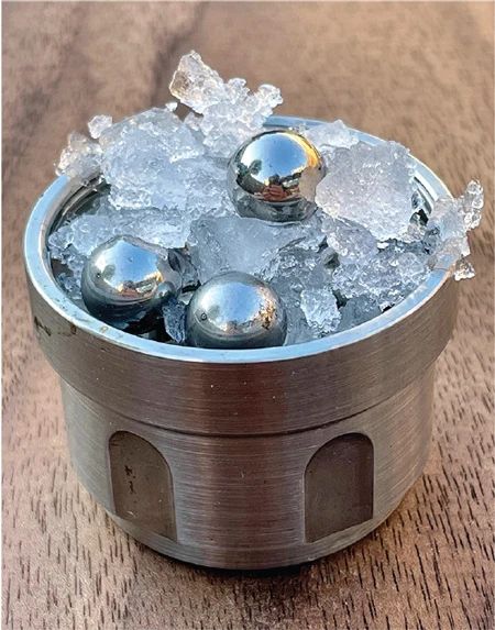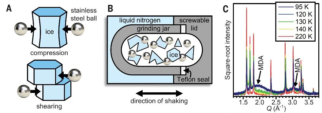 在球磨机中低温研磨,制备新型无定形冰MDA。图片来源:Nature [5]研究者首先将研磨罐冷却至77 K,加水结冰之后再装入不锈钢球,然后在低温下进行球磨。非晶化过程的核心是球与晶体的碰撞中压缩力和剪切力的综合作用。尽管局部熔化效应已被认为是非晶化的起源,但位错缺陷的引入似乎是主要驱动力。80次球磨循环后,球磨冰的整体外观是由密实粉末组成的大块。从宽X射线衍射中可以看到,这些粉末就是无定形冰。