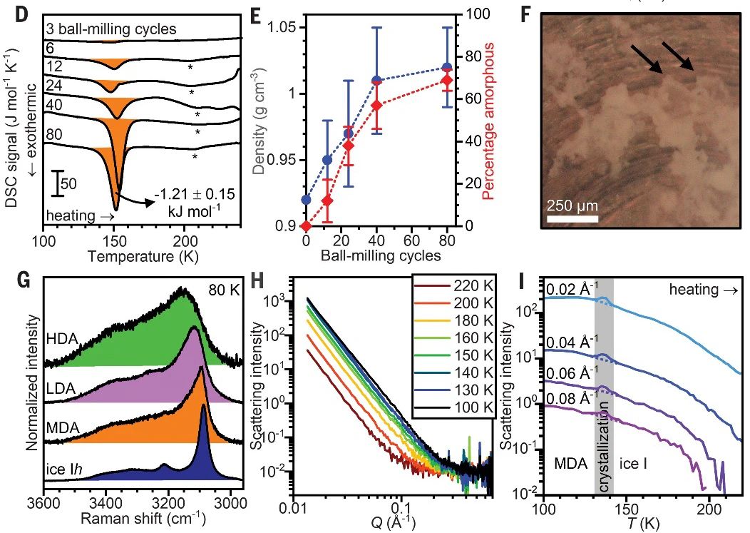 通过使用液氮中的浮力测量法,该无定形冰在77 K下的密度为1.06 ± 0.06 g cm–3,介于此前报道的LDA和HDA之间。差示扫描量热分析表明,非晶化过程在40次球磨循环后就接近完成,80次循环后,非晶化程度稳定在70%左右,且使用不锈钢球的非晶化效果最好。循环后还可以观察到一些具有锐利边缘的透明颗粒,这应该是随着MDA的形成,一小部分冰晶体将越来越难以受到球磨的影响。MDA是不是HDA向LDA转化的过渡态呢?为了回答这个问题,研究者发现,一般过渡态在稍微升温后,都会转变为LDA,而这种MDA只会转变为一种名为ice Isd的冰晶体。此外,过渡态通常是不均匀的,而小角X射线散射则显示,MDA具有各向同性,结构均匀。总之,基于不同的相变、热稳定性和衍射特性,MDA是水的一种新型的无定形态。