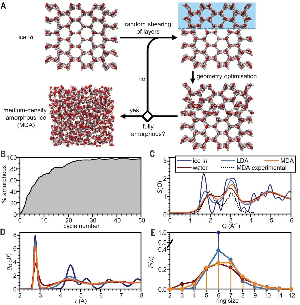 这一结果与非晶化过程的模拟相吻合。计算从包含2880个水分子的普通冰晶体开始,随机进行剪切,直到结构因子收敛。非晶化过程中,冰密度从0.92增加到0.97 g cm–3,略低于实验结果,这可能是因为计算采用刚性水分子模型,忽略了氢键弯曲所导致的。此外,计算模拟沿随机方向剪切,导致了最大程度的无序结构,然而,实验情况可能略有不同,最初的剪切力沿着晶体的特征解理面方向。