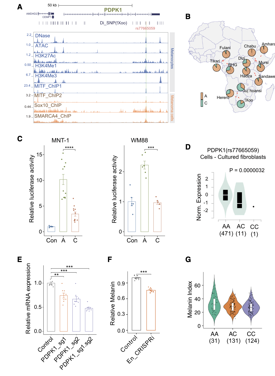 基于人类参考基因组,研究共发现3200万个单核苷酸多态性位点(single nucleotide polymorphism, SNP),其中大约530万个位点是在之前没有发现的。这些新发现的突变广泛的存在于增强子、启动子以及转录因子结合位点等基因组功能区域。研究发现12个非洲民族的平均SNP个数和遗传多态性均具有显著的差异。以打猎和收集为生的桑人(Ju|’hoansi和!Xoo)和热带雨林小矮人(rainforest hunter-gatherther, RHG)的SNP数量和遗传多态性最高,而Amhara,Fulani,Chabu以及Hadza等民族的遗传多态性则最低。而大量非洲外人群的基因渗入(在Amhara和Fulani人群中)以及严重的群体瓶颈(在Hadza和Chabu人群中)是造成部分非洲人群体遗传多态性低的主要原因。例如,生活在坦桑尼亚的Hadza和埃塞俄比亚的Chabu群体的人口数量已经少于1000人。现代桑人与热带雨林小矮人的共同祖先在现代人类进化中最早发生分歧在研究中,科学家利用邻近距离法(Neighbor-joining method)对本研究中的12个民族,和来自“千人基因组计划”的欧洲人群(CEU)、北方汉族人群(CHB)、托斯卡纳人群(TSI)以及来自“西蒙斯基因组多态性研究计划”中的巴布亚人群(Papuan)进行了系统计划分析,结果显示现代桑人的遗传学祖先是现代人类最早发生分歧的一支,随后发生分歧的是热带雨林小矮人的祖先。现代桑人和小矮人祖先的早期分歧的现象也被主成分分析(principal component analysis, PCA)和ADMIXTURE所支持。研究发现,不同民族在系统进化树的聚类模式与他们目前所处的地理环境显著相关,这说明地理环境是制约不同民族间基因交流的重要因素。当然,由于存在基因交流和遗传重组等因素的影响,上述邻近距离法、主成分分析和ADMIXTURE无法用来构建现代人类早期遗传结构。而当科学家将这些因素全部纳入到复杂模型中进行计算分析时却进一步发现:现代桑人和小矮人的共同祖先,而不是现代桑人的祖先,是现代人类最早分歧的一支。并且研究推断现代人类的分歧发生在28万年前,这与之前的考古和基于古DNA检测推断的时间一致。同时,科学家们在本研究中利用PCA和ADMIXTURE分析,还在目前坦桑尼亚说Kheosan语言的Hadza和Sandawe的基因组中发现了桑人相关的祖源成分。虽然仅有南部非洲的桑人以及东非坦桑尼亚的Hadza和Sandawe说Khoesan语言,但本项研究利用PCA分析,将全球之前已发表的来自不同地区的55个古非洲人样本投射到现代非洲人样本中后发现,大量的来自不同地区的古非洲人样本投射位于桑人和东非的Hadza与Sandawe人群之间,但是这些地区目前却没有讲Khoesan语言的民族。该结果提示,Khoesan语系在非洲的地域分布曾经很广,遍及整个非洲, 但可能受到班图大迁徙的影响,目前说Koesan语的古非洲人群大都灭绝了。研究中,科学家团队还结合正选择分析的算法、功能基因组学手段和方法以及大规模全基因组关联分析的结果,对12个非洲民族特异的适应性进化进行研究,全面绘制了一副非洲人群适应性进化的图谱。肤色多样性是现代人类对于不同维度地区适应性进化的一个重要标志。桑人是非洲人群中肤色最浅的民族,但是研究对于桑人浅肤色的遗传学基础仍然缺乏了解。利用功能基因组学等方法,本研究发现一个位于PDPK1基因内部增强子的突变rs77665059-C,是影响桑人浅肤色的一个决定性的因素。该增强子仅在黑色素细胞中特异活跃,使用Crispri沉默该增强子会降低PDPK1基因的表达量和黑色素和合成。研究进一步发现rs77665059-C在桑人部分人群中频率超过了80%;但是在其它非洲(平均频率14%)和非洲外民族中(平均频率3%)频率却非常低。研究发现rs77665059-C突变会导致PDPK1基因增强子在黑色素瘤细胞系中活性降低,降低PDPK1基因的表达,并且与桑人中的浅肤色表型显著相关,这为桑人浅肤色进化的研究提出了新的遗传学解释。樊少华从2018年起,在复旦大学工作。主要研究方向包括:人类迁徙、分歧时间以及遗传结构;适应性进化对不同民族表型多样性和疾病易感性的影响;基因组结构变异的对于表型多样性的影响。以第一作者在Nature、Science、Cell等高水平学术期刊上发表论文,目前总引用超过3800次。原文链接:https://www.cell.com/cell/fulltext/S0092-8674(23)00101-0